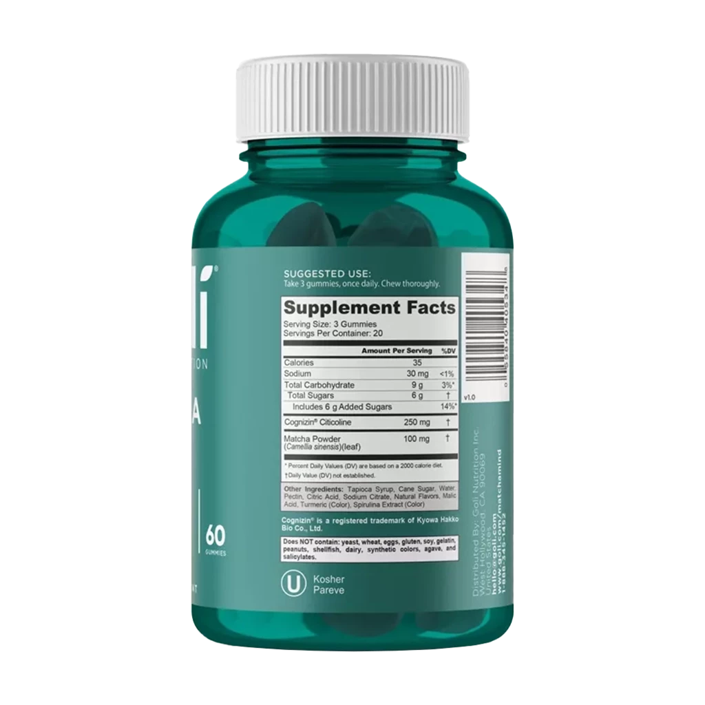 Ingrediente principale: Aceste jeleuri delicioase conțin o combinație unică de Cognizin® Citicoline și pudră de Matcha. Cognizin® Citicoline este o formă patentată de citicolină,iar pudra de Matcha este obținută din frunze de ceai verde fin măcinate. Alte ingrediente includ sirop de tapioca, zahăr din trestie, pectină și arome naturale.